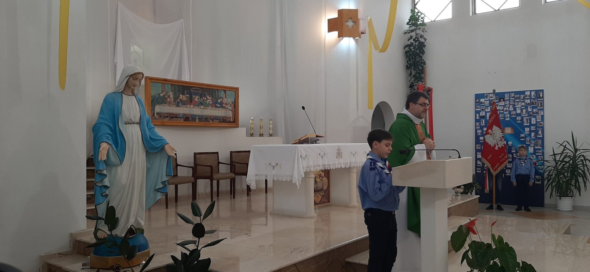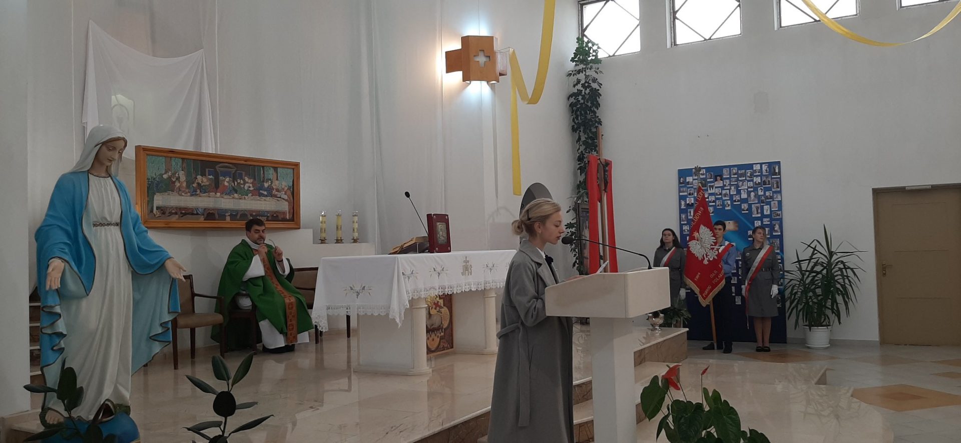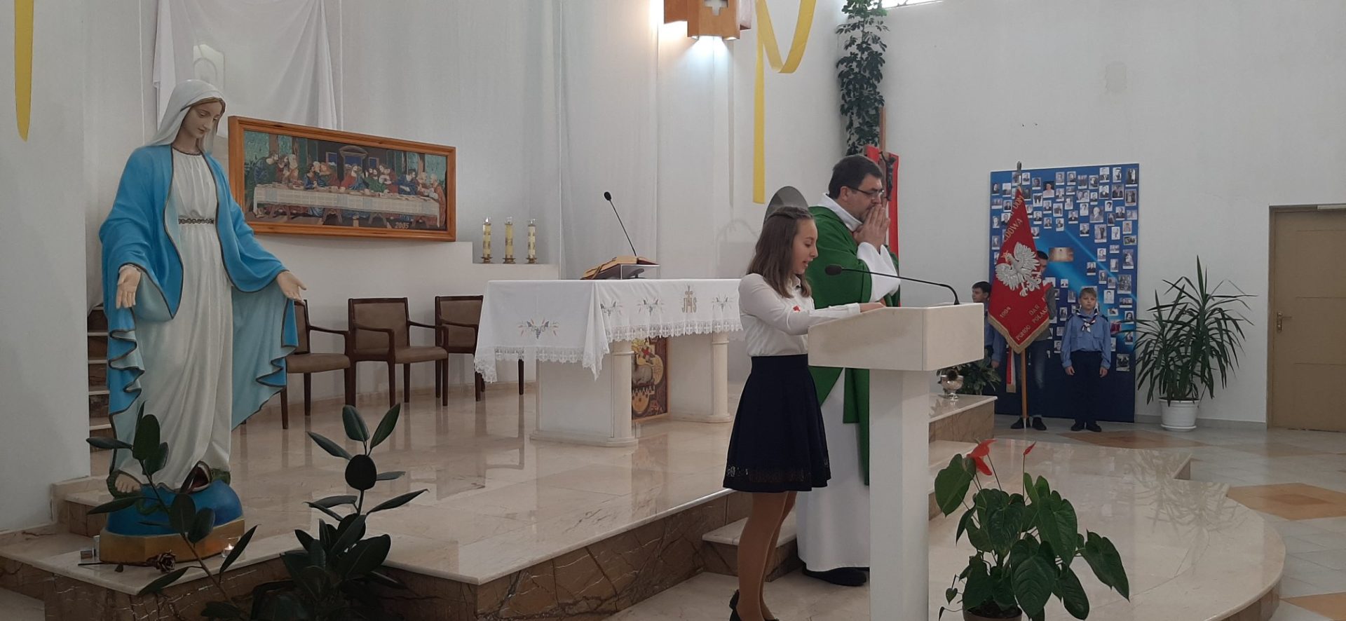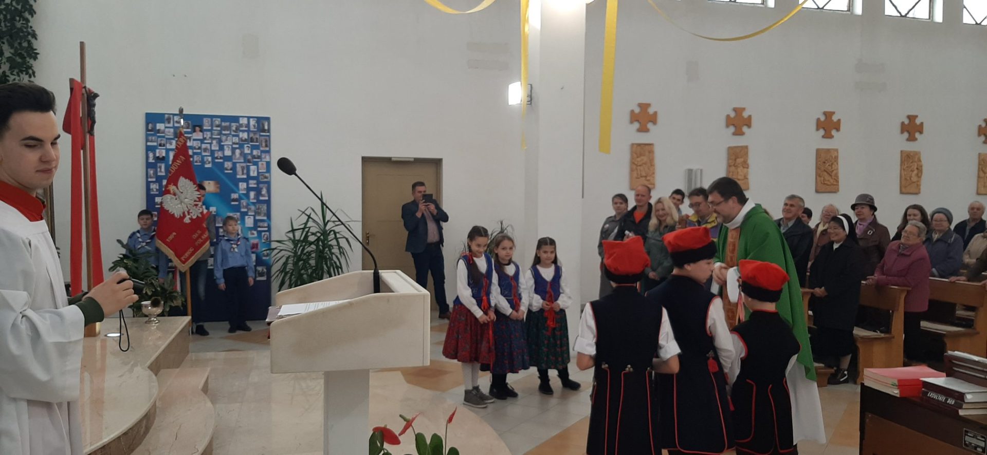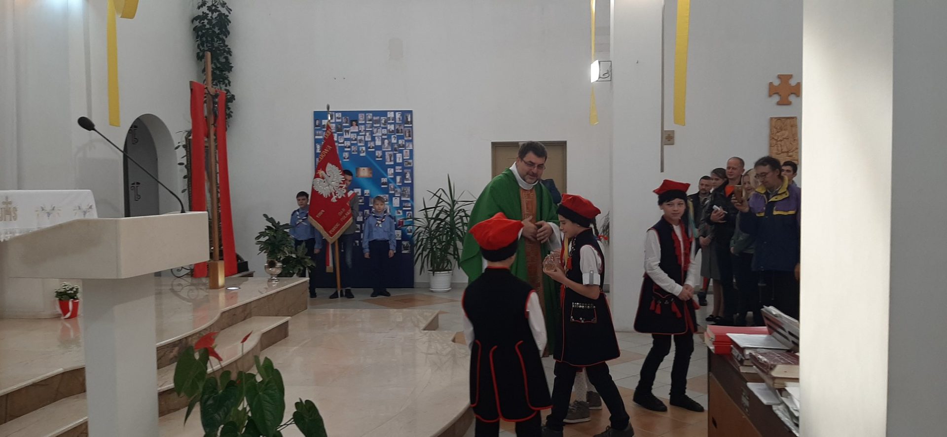 Z tej okazji, w niedzielę 10 listopada, zebraliśmy się w kościele na uroczystej Mszy Świętej w języku polskim, której przewodniczył ksiądz proboszcz – Jacek Puć. O uroczystym wymiarze Mszy może świadczyć obecność pocztu sztandarowego i harcerzy.