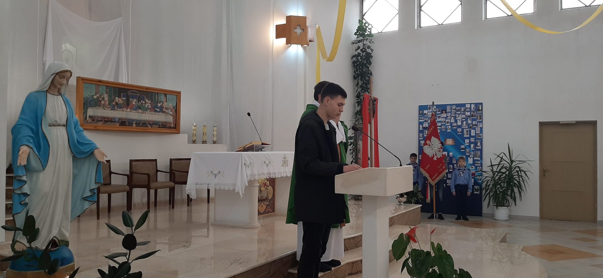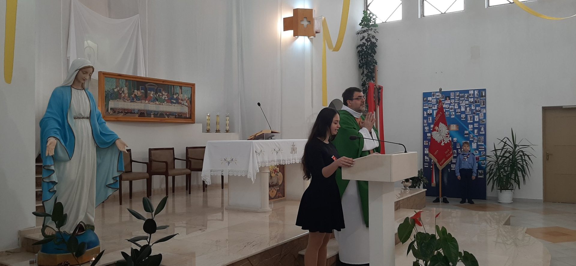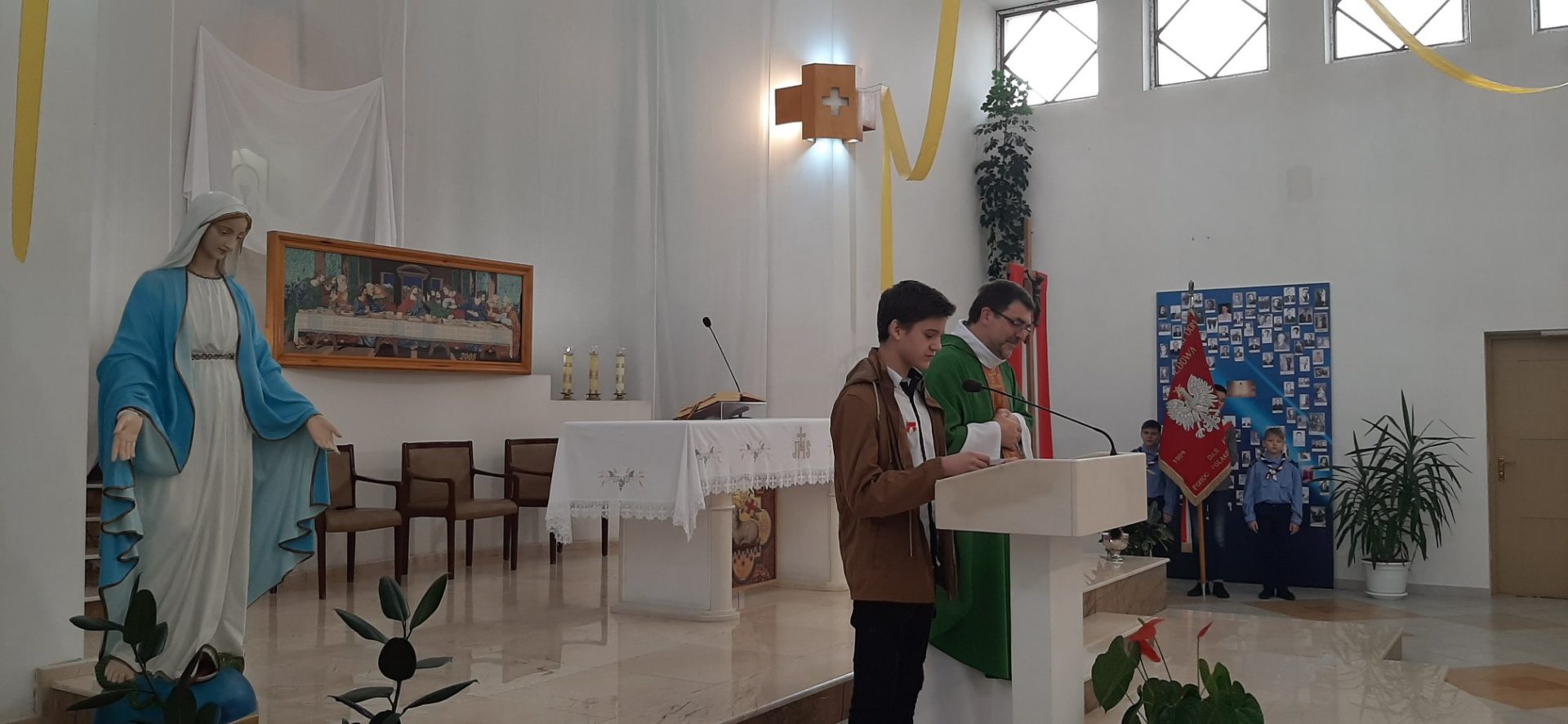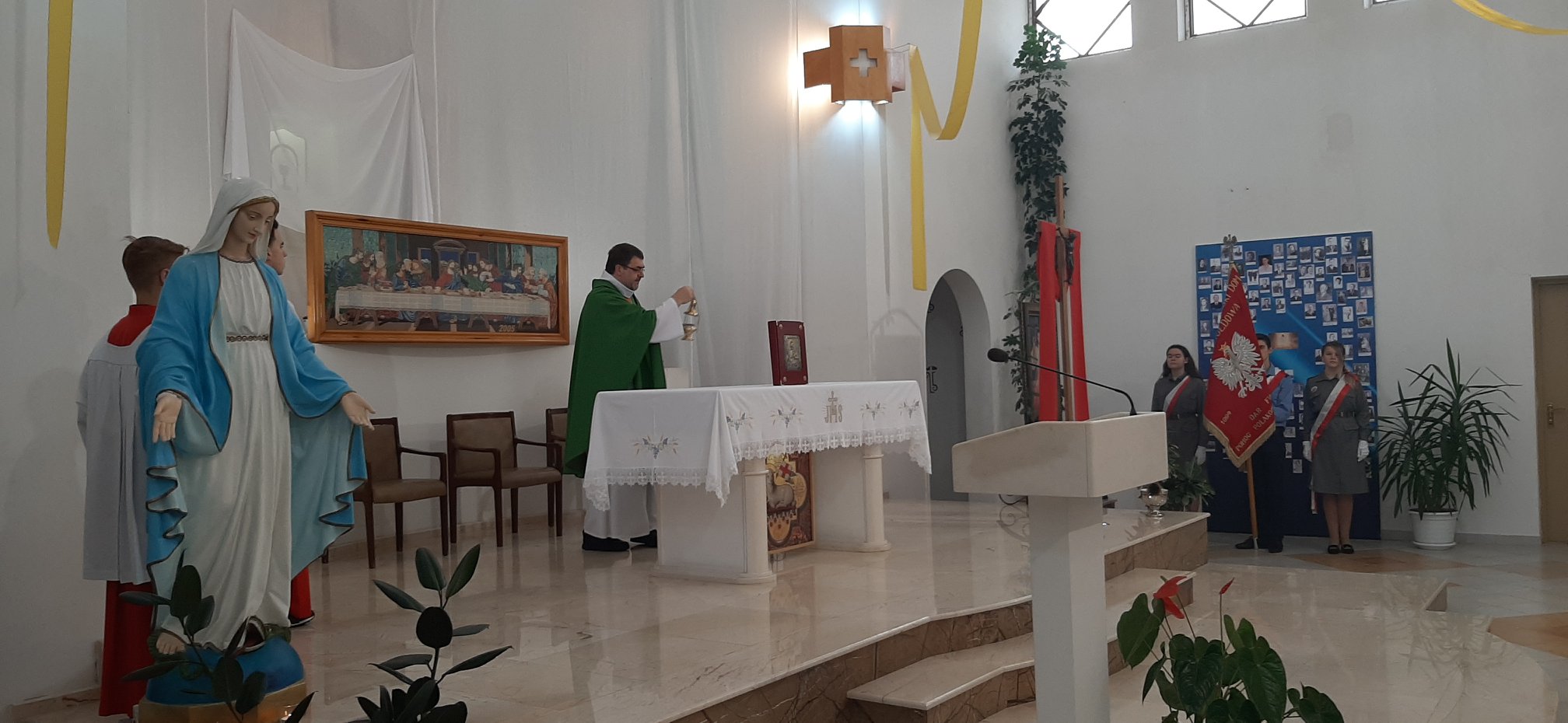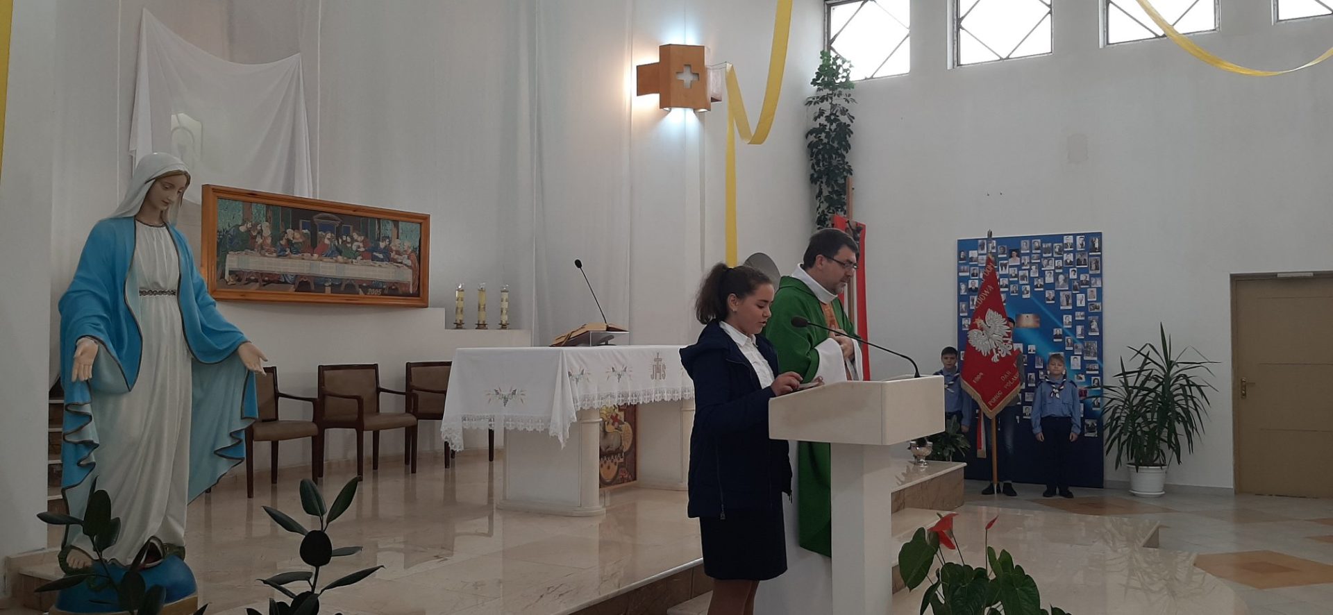 Z tej okazji, w niedzielę 10 listopada, zebraliśmy się w kościele na uroczystej Mszy Świętej w języku polskim, której przewodniczył ksiądz proboszcz – Jacek Puć. O uroczystym wymiarze Mszy może świadczyć obecność pocztu sztandarowego i harcerzy.
