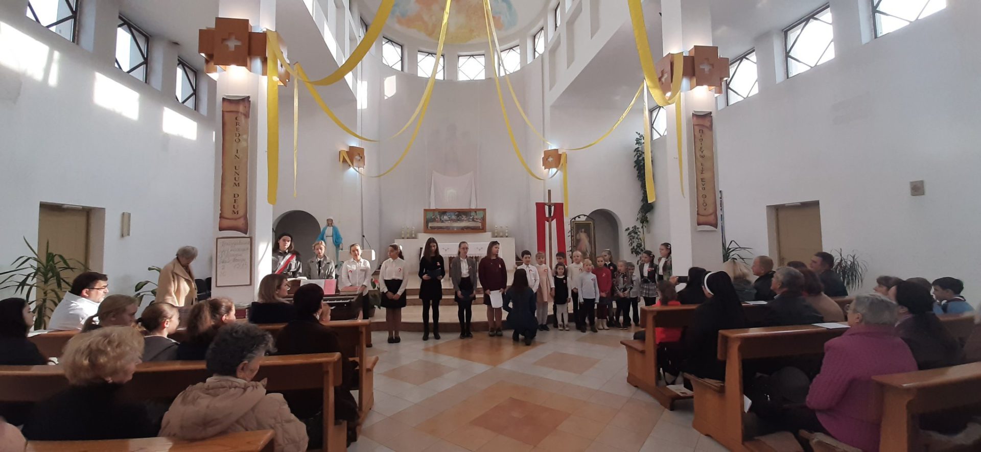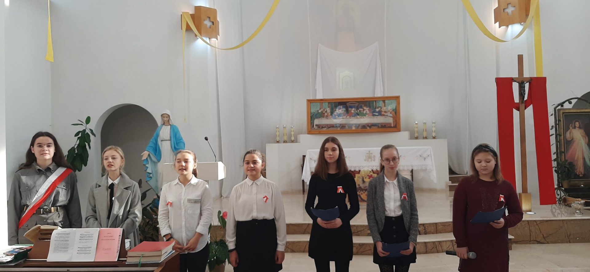 Uczniowie przygotowali czytania i modlitwę wiernych, zabrzmiały także pieśni religijne w języku polskim. Dziewczęta i chłopcy w strojach ludowych złożyli również dary.