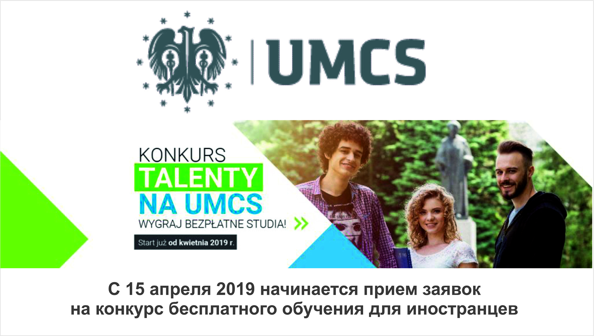 Od 1 kwietnia 2020 r. rozpoczynamy rejestracje do konkursu „Talenty na UMCS” na rok akademicki 2020/2021. Program ten daje możliwość rozpoczęcia bezpłatnych studiów na naszej uczelni. W konkursie mogą wziąć udział utalentowani kandydaci zagraniczni, którzy mają osiągnięcia