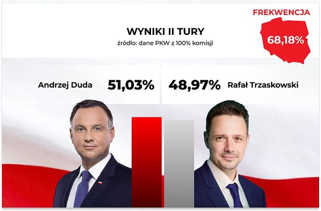 Na Prezydenta RP został wybrany Andrzej Duda; uzyskał on 51,03 proc. głosów; na jego kontrkandydata Rafała Trzaskowskiego zagłosowało 48,97 proc. wyborców – poinformował w poniedziałek przewodniczący PKW Sylwester Marciniak. Frekwencja wyborcza w II turze głosowania wyniosła 68,18 proc.