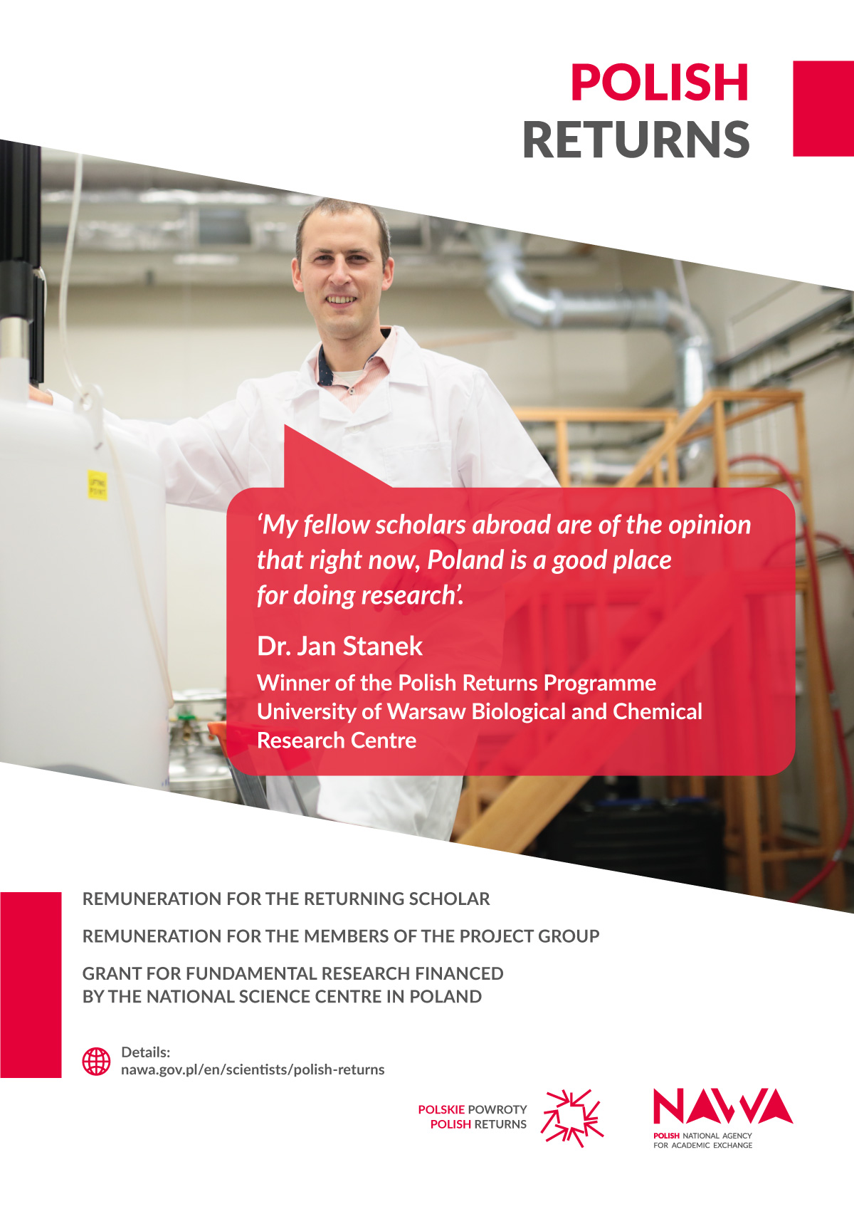 Polish Returns Programme 2020, 7 January 2020 – 31 March 2020 – The Polish National Agency for Academic Exchange (NAWA) opens the call for proposals under the Polish Returns Programme. The aim of the Polish Returns Programme is to allow prominent Polish scientists to return to their country and take up employment in Polish higher education institutions, scientific units or research institutes. The Programme will create optimal conditions for returning scientists to conduct world-class scientific research or developmental work in Poland. The funds obtained under the Polish Returns Programme are to ensure salaries for Returning Scientists and allow them to create a project group (research team).