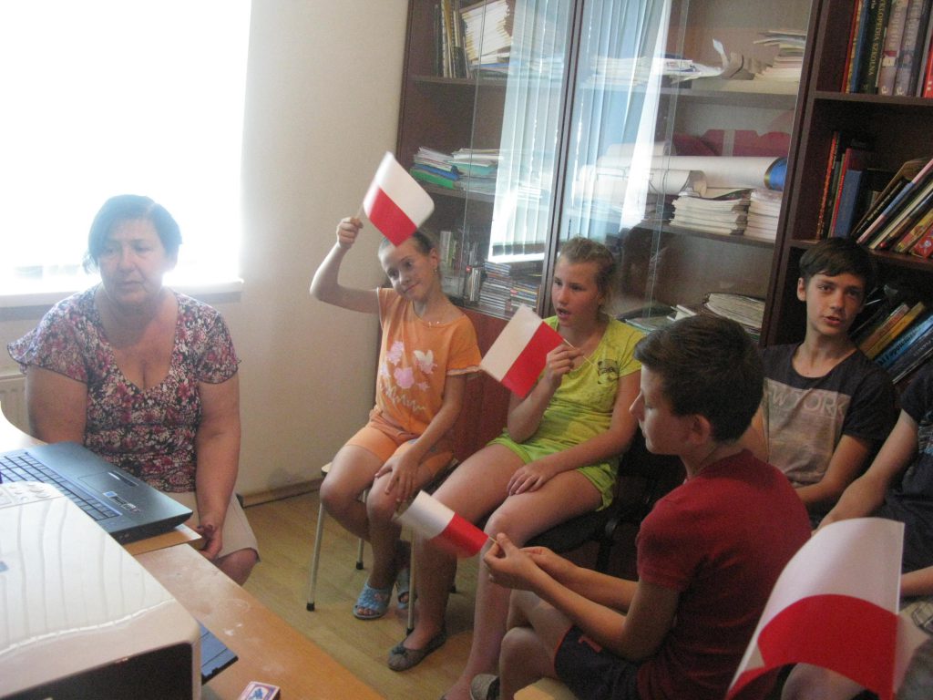 Dzieci obejrzały filmy edukacyjne ,przypomniały sobie najważniejsze symbole Polski,śpiewały pieśni patriotyczne,bawiły się grą edukacyjną układając i kolorując godło Polski oraz wstawiały słowa w miejce rysunków zapisując tekst mazurka Dąbrowskiego.Z wielkim zainteresowaniem obejrzały film „Jan Matejko.Konstytucja 3 maja 1791r. Animacja.”Była to wspaniała lekcja historii.Zakochany w polskiej historii Jan Matejko przedstawił autorską interpretację tego wielkiego wydarzenia.Analiza postaci z dzieła malarza oddaje ich charakter.Jest też bardzo dokładna.Poznaliśmy króla Stanisława Augusta Poniatowskiego,Kołłątaja,Stanisława Małachowskiego,a nawet targowiczan .