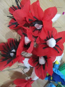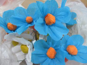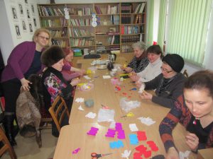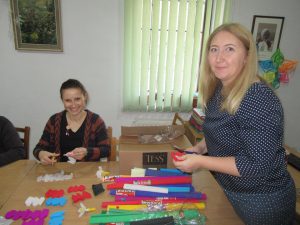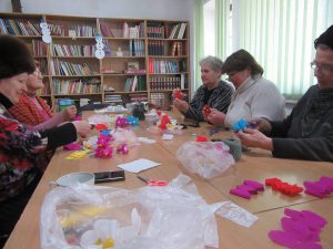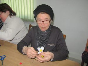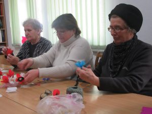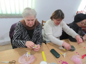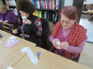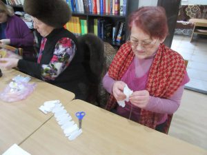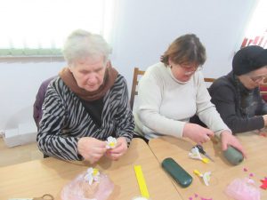 15 marca Spotaliśmy się z Seniorkami, jak w przeszłym roku wyrabialiśmy kwiatki dla palm wielkanocnych.