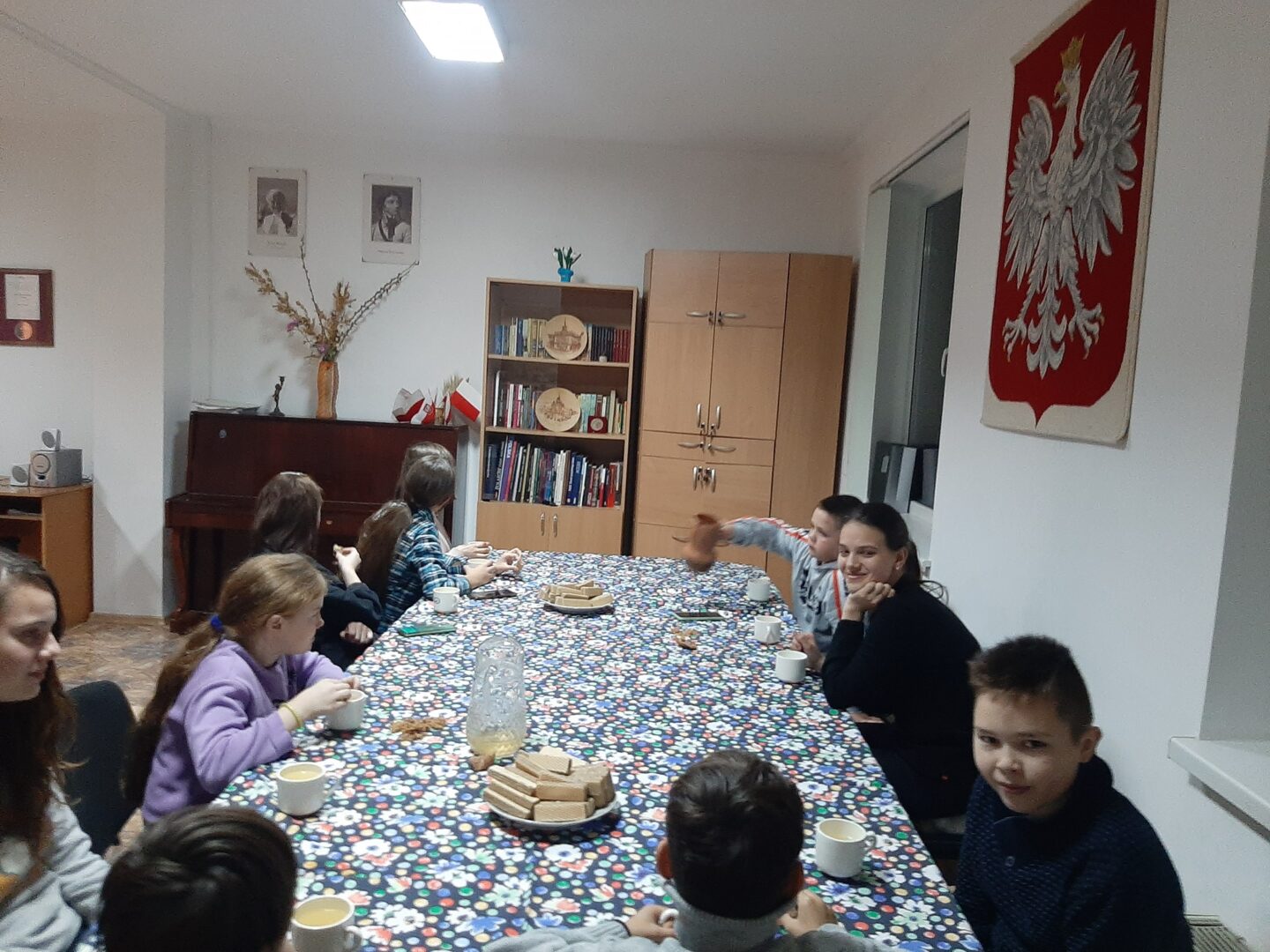 A po uroczystości było wspólne biesiadowanie. Dzieci zajadały się smacznymi wafelkami otrzymanymi od Pani Wiktorii. Piły także soki przygotowane przez Pania Ludę z owoców styrczańskiego sadu.